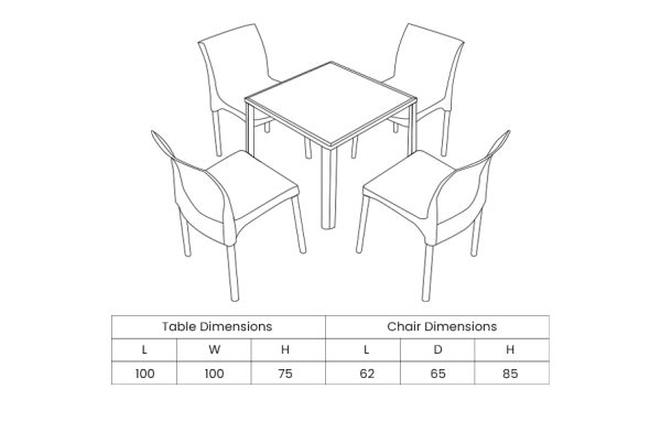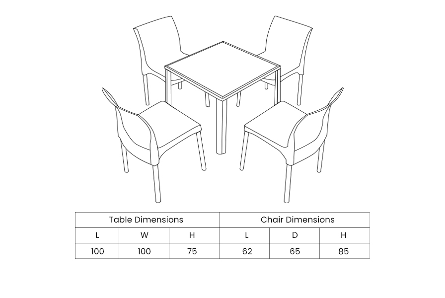 Upgrade your outdoor dining experience with the Ellements Indiana Dining Set. This set features 4 stylish chairs with plush seat cushions and a sleek square table topped with toughened glass for added durability and elegance. Perfect for patios, balconies, or garden spaces, the Indiana Dining Set combines contemporary design with comfort, creating an inviting space for meals and gatherings outdoors.